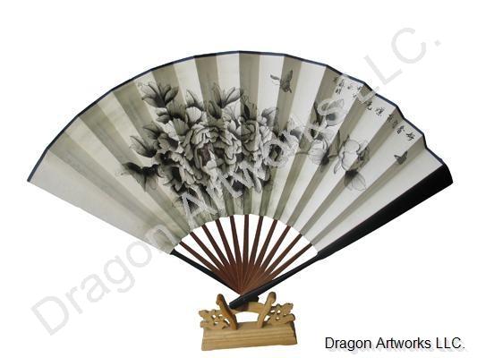 Features calligraphy words and an image of butterflies and peony flowers. Handcrafted of rice paper on bamboo ribs and measures approximately 30cm wide. All our fans include a fan stand to display the fan and come in a beautiful Chinese gift box, so they make great gifts for anyone who loves fans or Oriental theme decor.