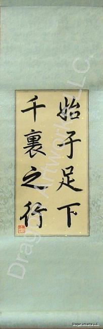 This Chinese idiom by Lao Zi calligraphy painting is a hand painted artwork mounted onto a traditional Chinese wall scroll measuring 8.5x26 inches. This Chinese idiom by Lao Zi calligraphy scroll painting means the journey of a thousand miles begins with single step.