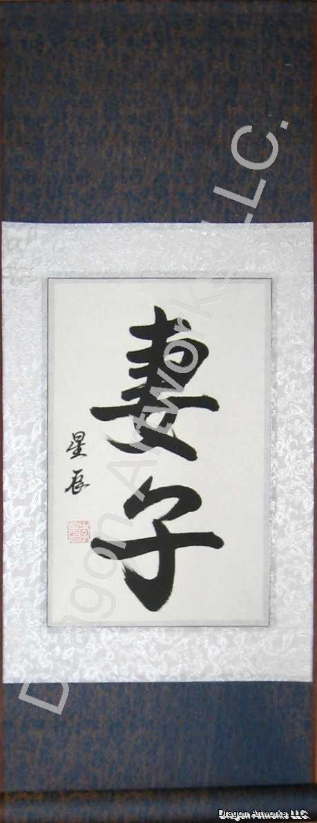 This Chinese Symbol for Wife Scroll Painting features the Chinese symbols for wife and measures 11x28 inches. The Chinese Symbol for Wife Scroll is made with blue silk brocade, the painting is surrounded by white silk brocade as shown in the picture. The Chinese Symbol for Wife Scroll Painting is a hand-painted art work by Beijing, China calligraphy artist Xing Chen.