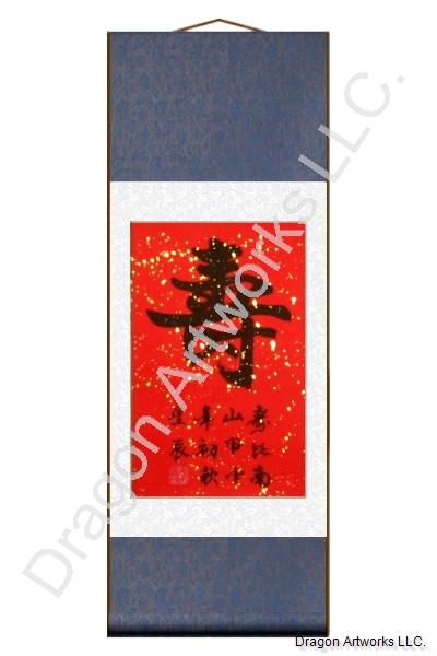 The Longevity scroll measures 11x29, the top and bottom of the scroll is dark blue silk brocade and the calligraphy painting is surrounded by white silk brocade. This Chinese wall scroll comes ready to hang on your wall. The small words on the Longevity scroll are an idiom meaning Old As a Mountain; that it was painted in the early autumn and the name of the artist.
