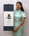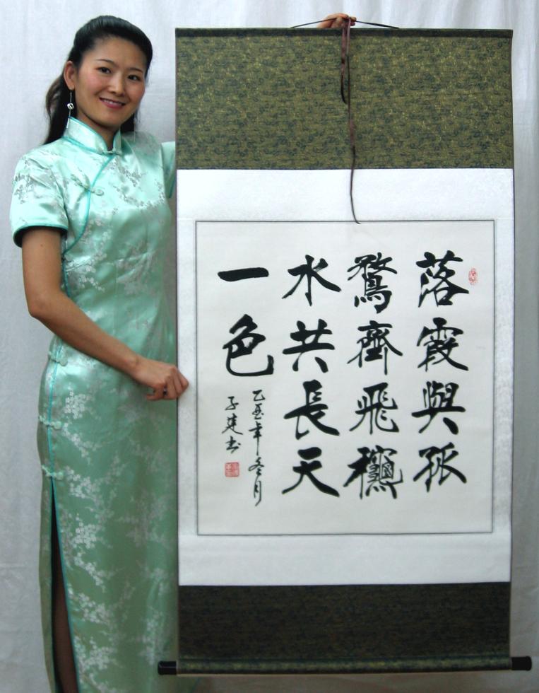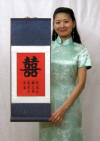 This Web page lists pictures of Chinese calligraphy paintings by various artists whose art works are listed on this site. The beautiful woman in these pictures who is holding the calligraphy paintings is my wife and the reason why the Chinese Calligraphy Store is able to offer you such low prices on art works listed on this Web site.